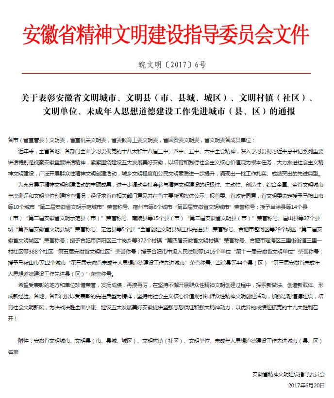 日前,安徽省精神文明建设委员会印发《关于表彰安徽省文明城市、文明县(市、县城、城区)、文明村镇(社区)、文明单位、未成年人思想道德建设工作先进城市(县、区)的通报》中,我校被授予“第十一届安徽省文明单位”荣誉称号,这是学校继荣获第九届、第十届省级文明单位后,再次取得此项殊荣。