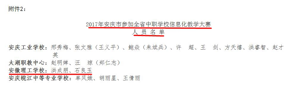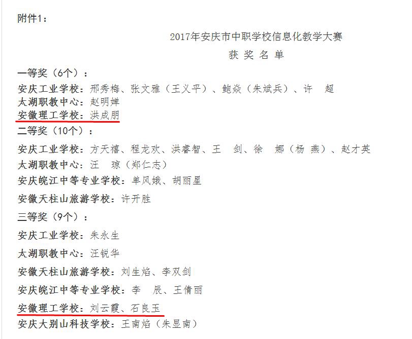 为提高我市中职学校教师教育技术应用能力和信息化教学水平,促进信息技术在中职教育教学中的广泛应用,安庆市教育体育局于2017年8月30日至31日组织了全市中职学校信息化教学大赛,我校教师在此次信息化教学大赛中喜获优异成绩。其中,洪成朋老师荣获一等奖,石良玉、刘云霞两位老师荣获三等奖。洪成朋、石良玉两位老师将代表安庆市参加2017年全省中职学校信息化教学大赛。