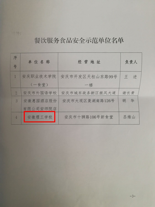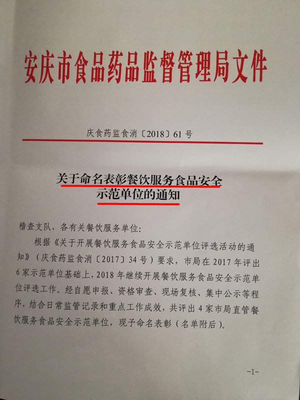 近日,安庆市食品药品监督管理局发文对全市荣获“2018年度餐饮服务食品安全示范单位”予以命名表彰。我校获此殊荣,成为全市2018年度餐饮服务食品安全示范单位。