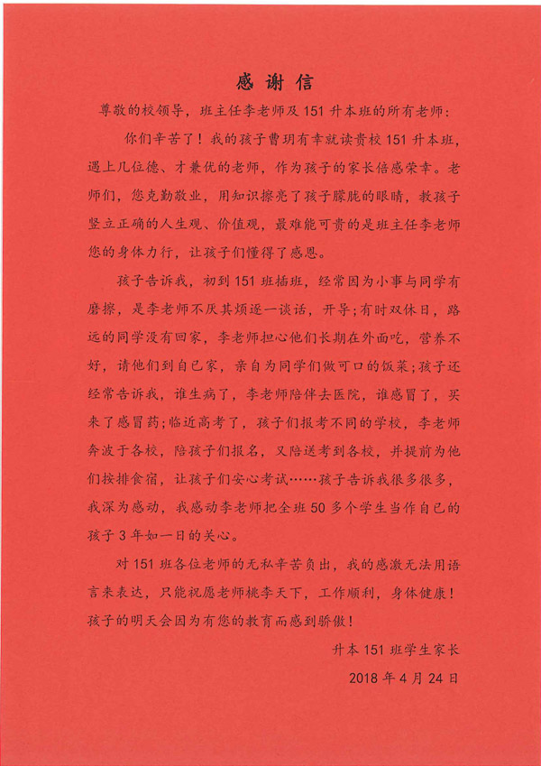 在升本151班孩子成长的路上,正因为有爱心的李芹玉班主任的陪伴与关爱,他们才能收获满满,顺利的考上本科,完成孩子人生的腾跃!正因为每一次来自李老师与家长内心的沟通与交流,才收获到家长对学校工作的理解、支持与信任。锦旗虽轻,情意深重。李老师通过自己的努力获得了家长的认可,为升本151班学生圆梦大学提供了有力保障。